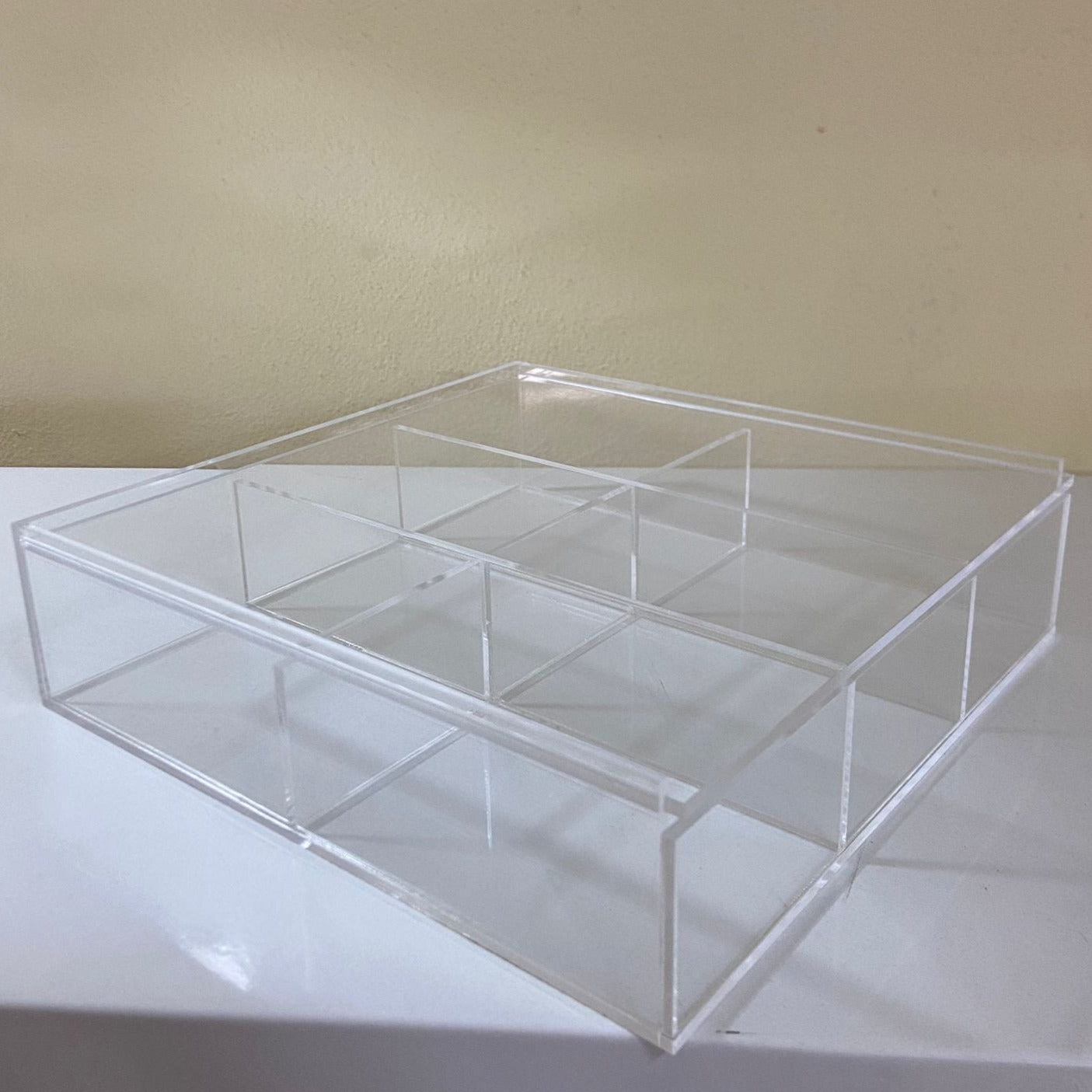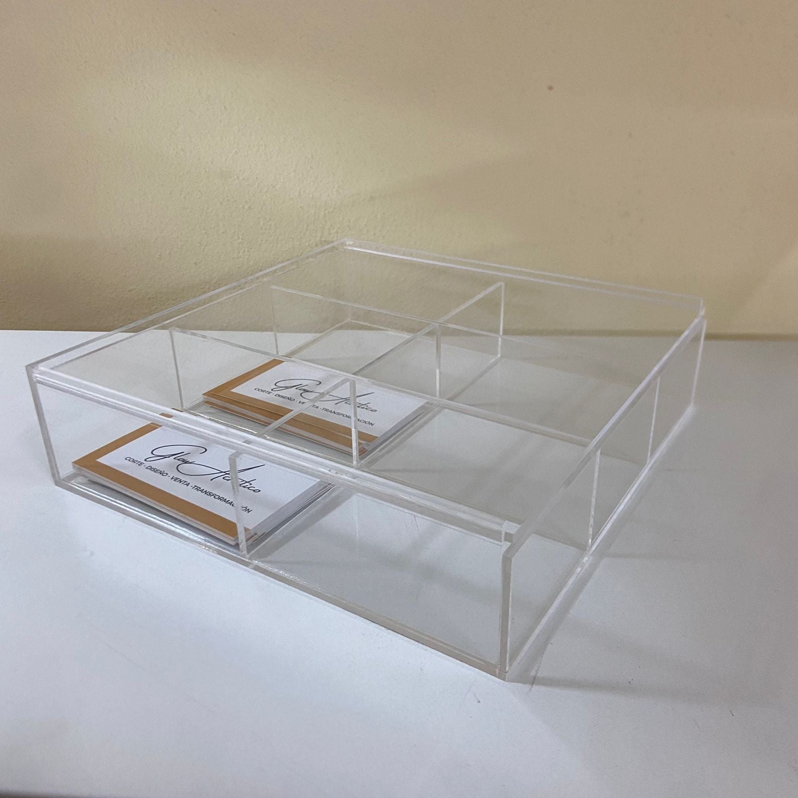 Caja organizadora con 6 divisiones con puerta deslizable.