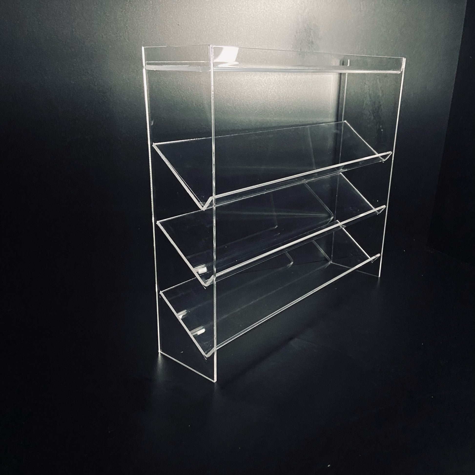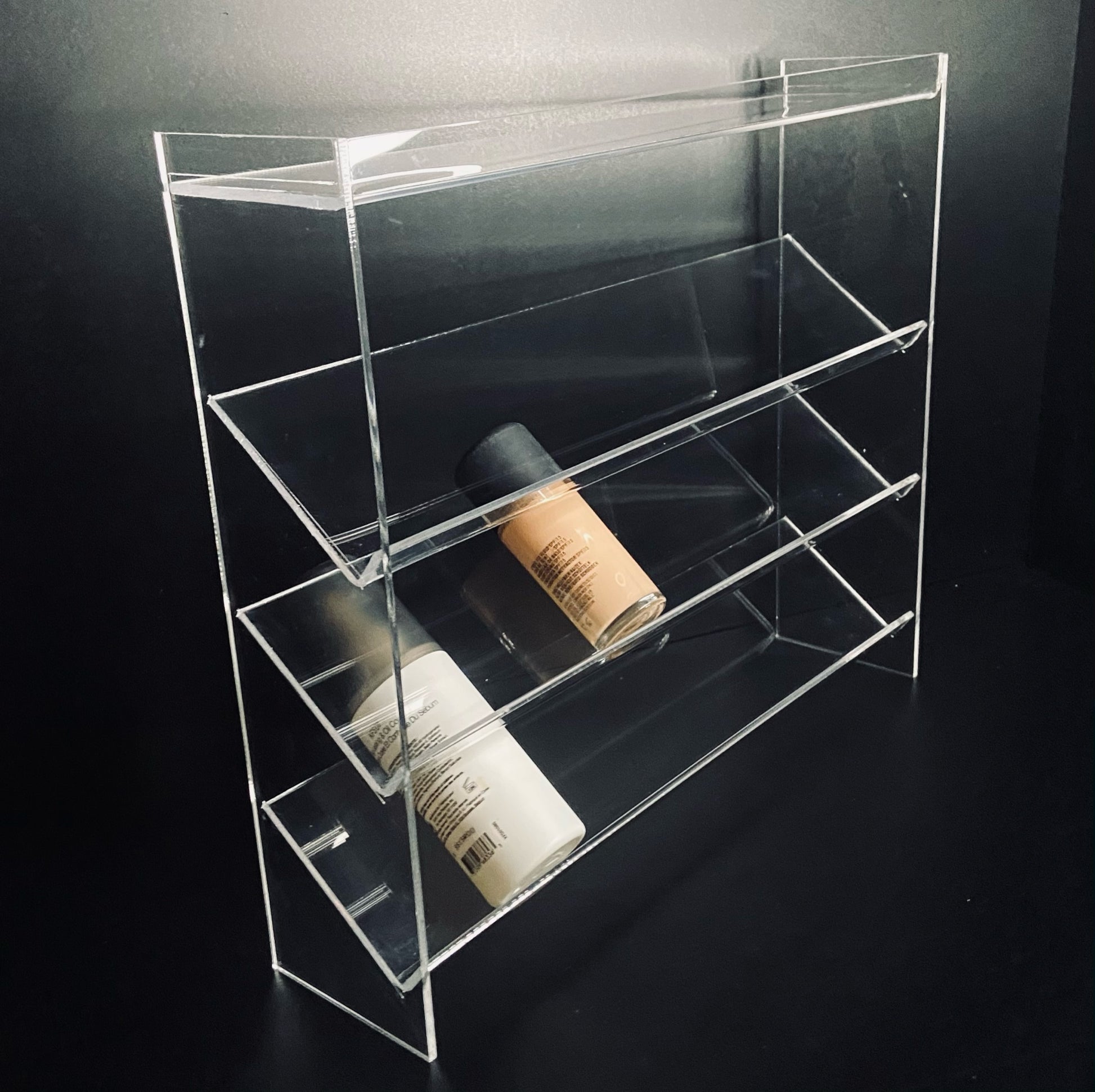 Organizador multiusos, con 3 repisas inclinadas. Ideal para maquillaje, labiales, esmaltes, artículos personales o de oficina, etc. Varios colores.