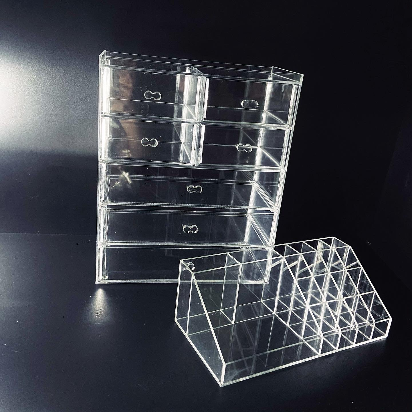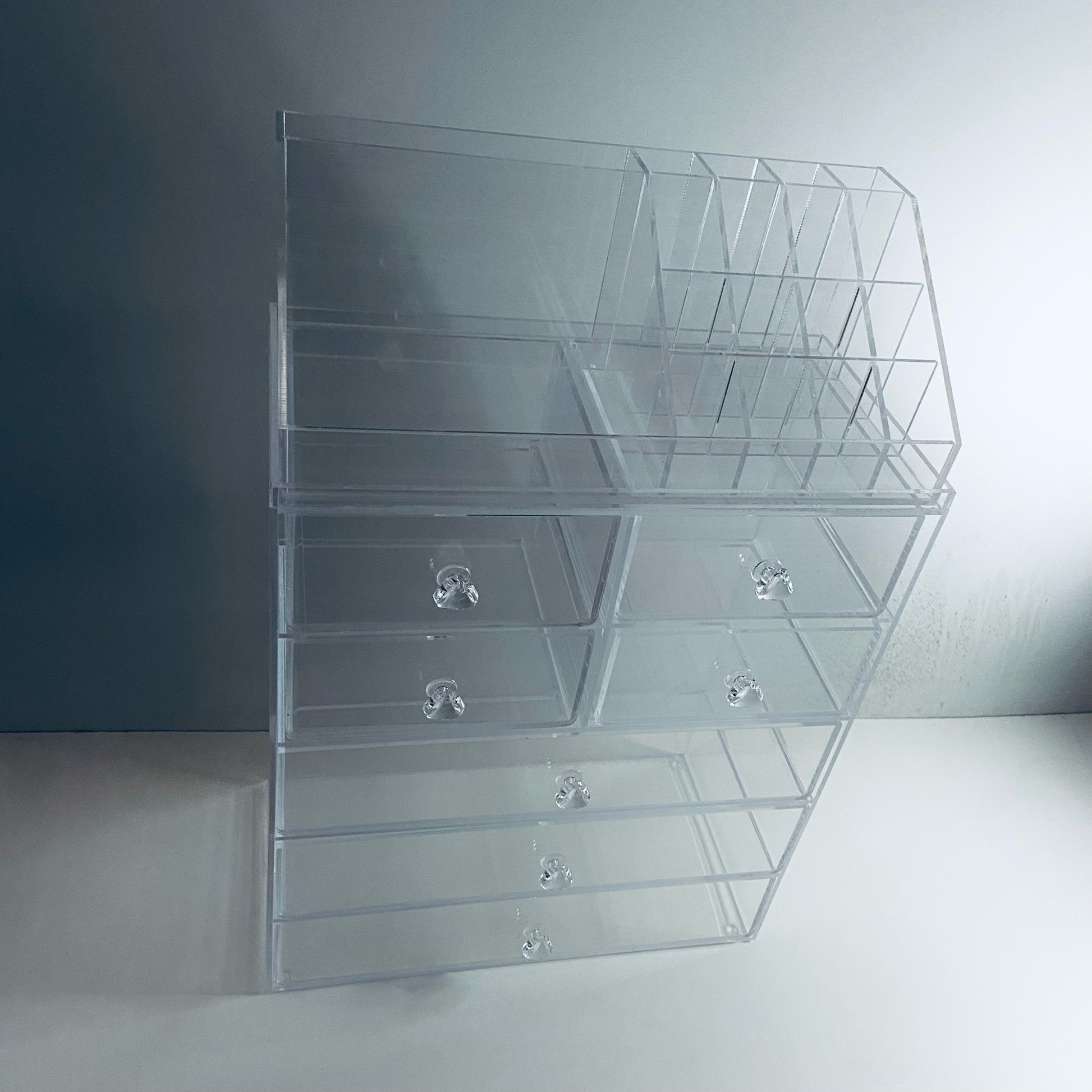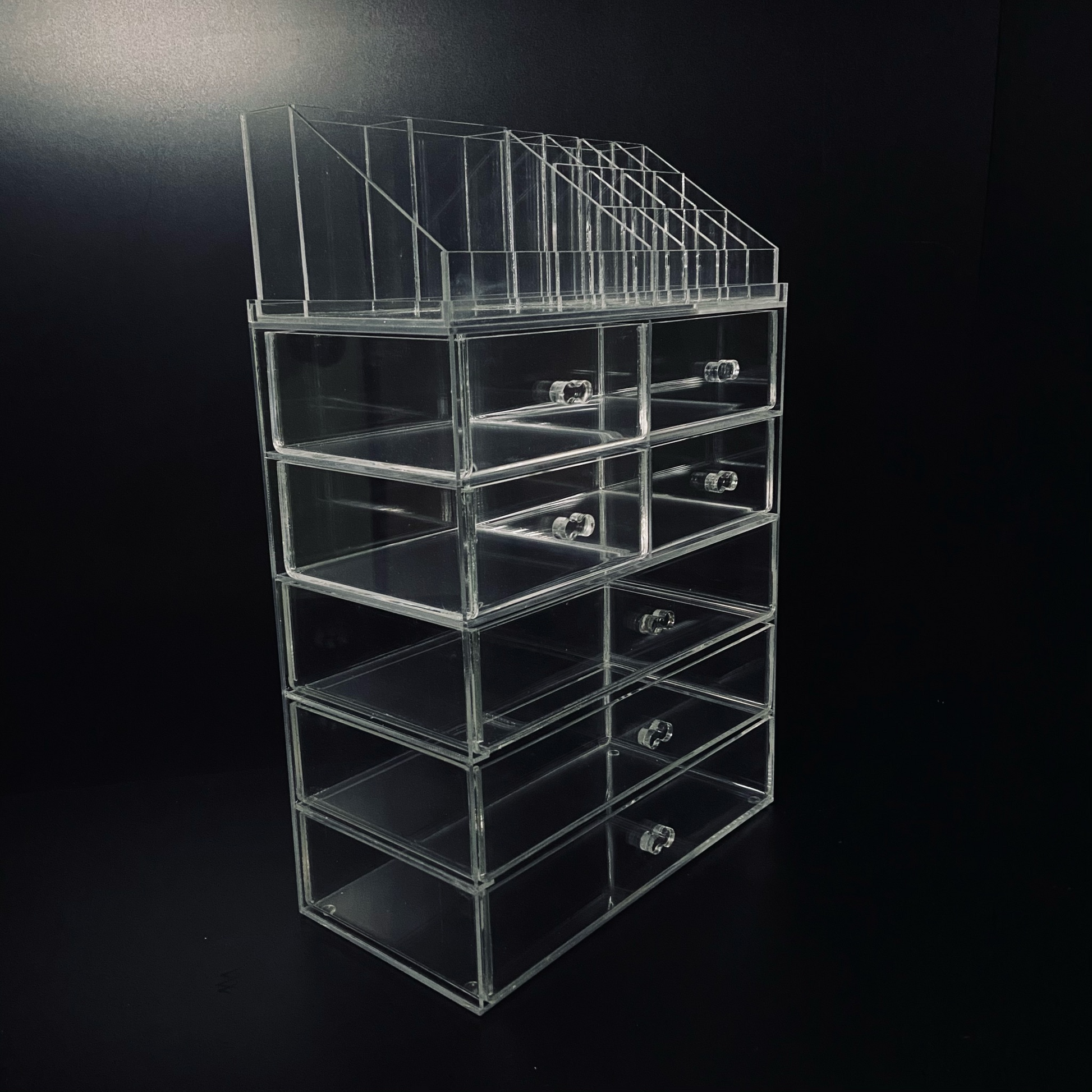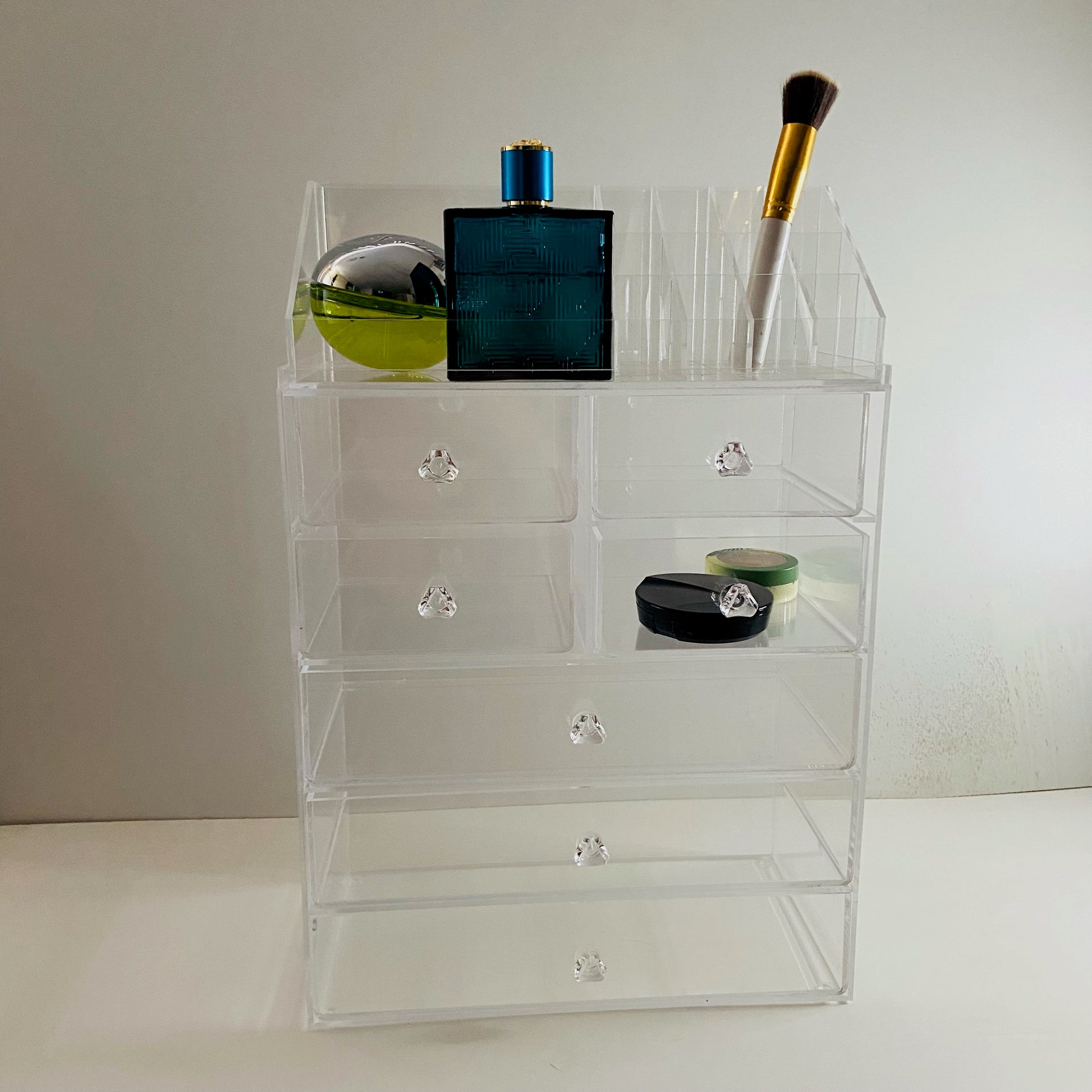 Organizador de acrílico, cuenta con 7 cajones (4 pequeños y 3 alargados) y una repisa desmontable en donde podrás guardar maquillaje, labiales, esmaltes, perfumes, entre otros artículos personales.