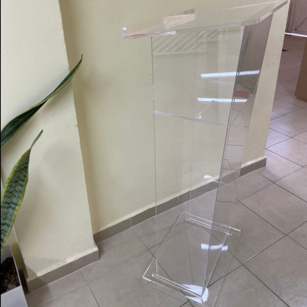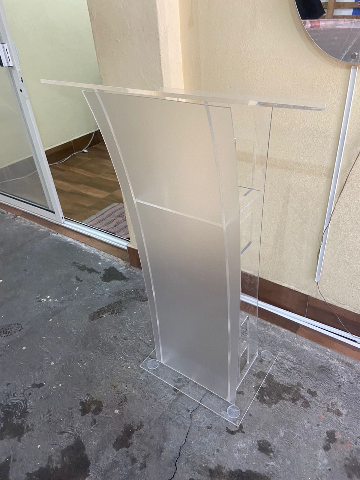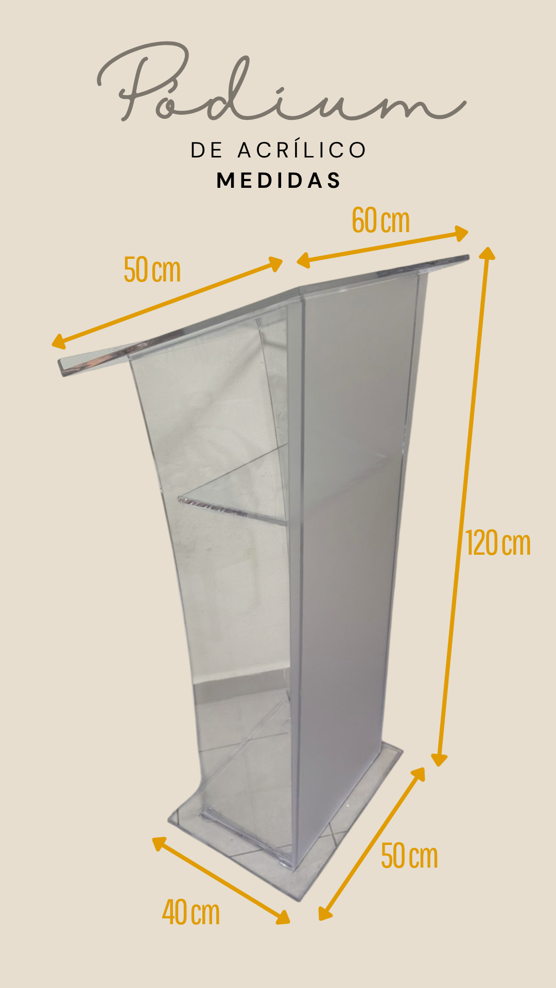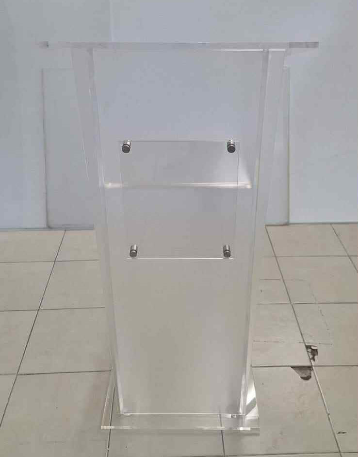 Pódium de acrílico de 9 mm o 12 mm de espesor, diseño estándar, fabricado con acrílico cristal y frente esmerilado.