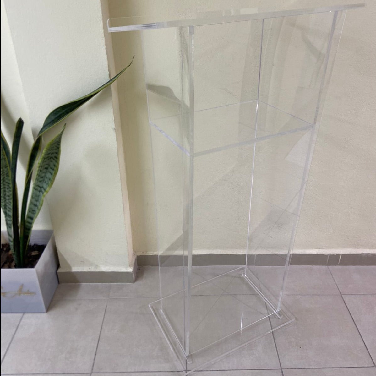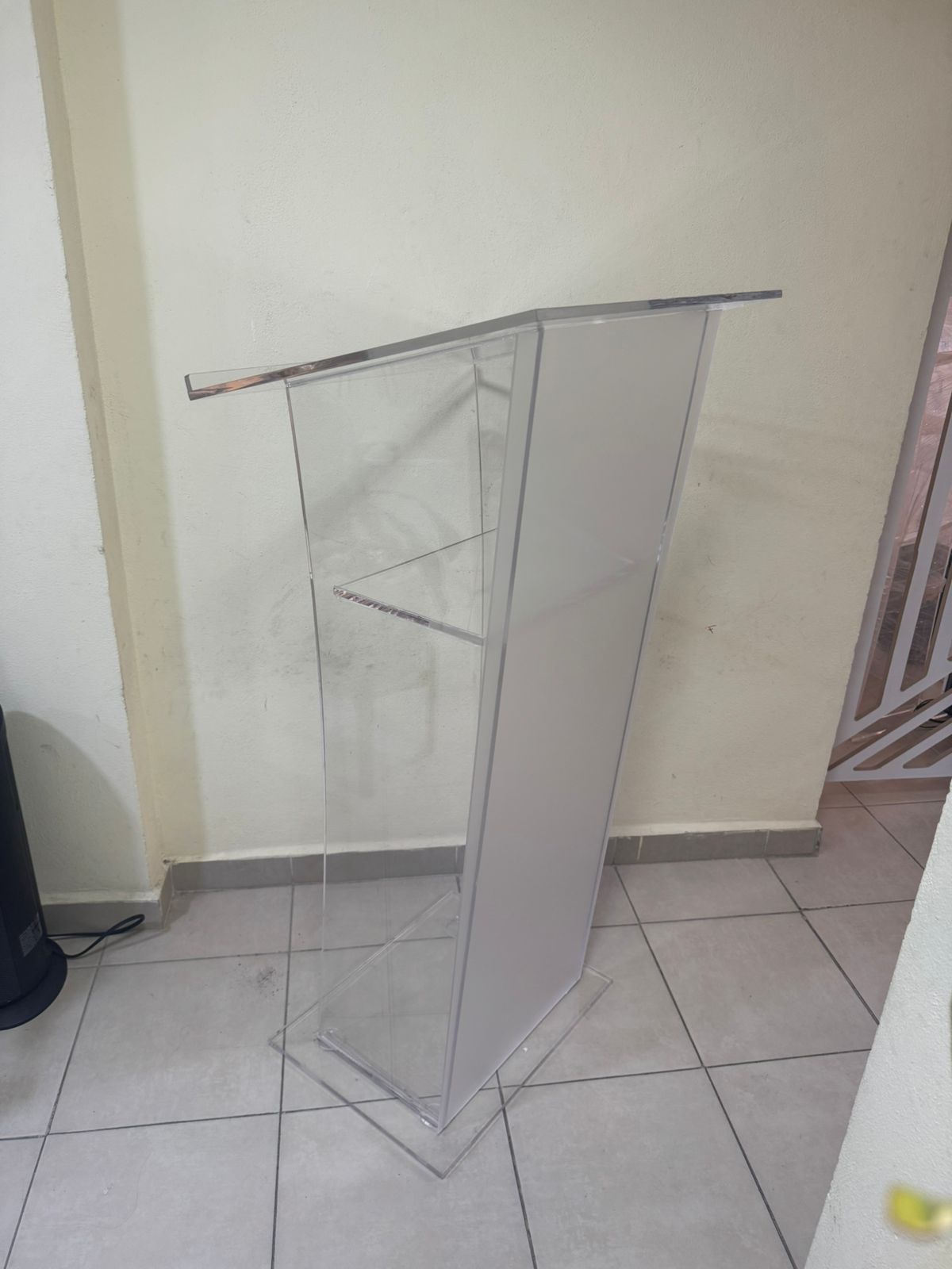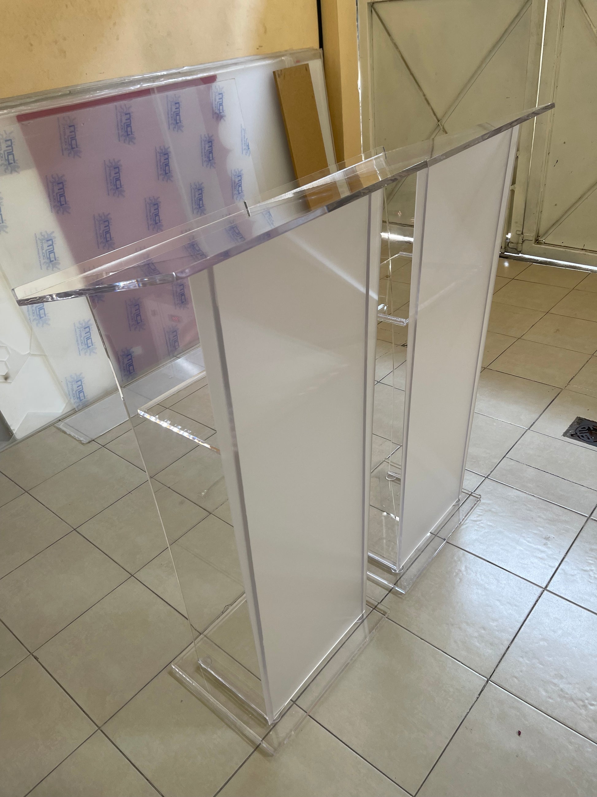 Pódium de acrílico de 9 mm o 12 mm de espesor, diseño estándar, fabricado con acrílico cristal y frente esmerilado.