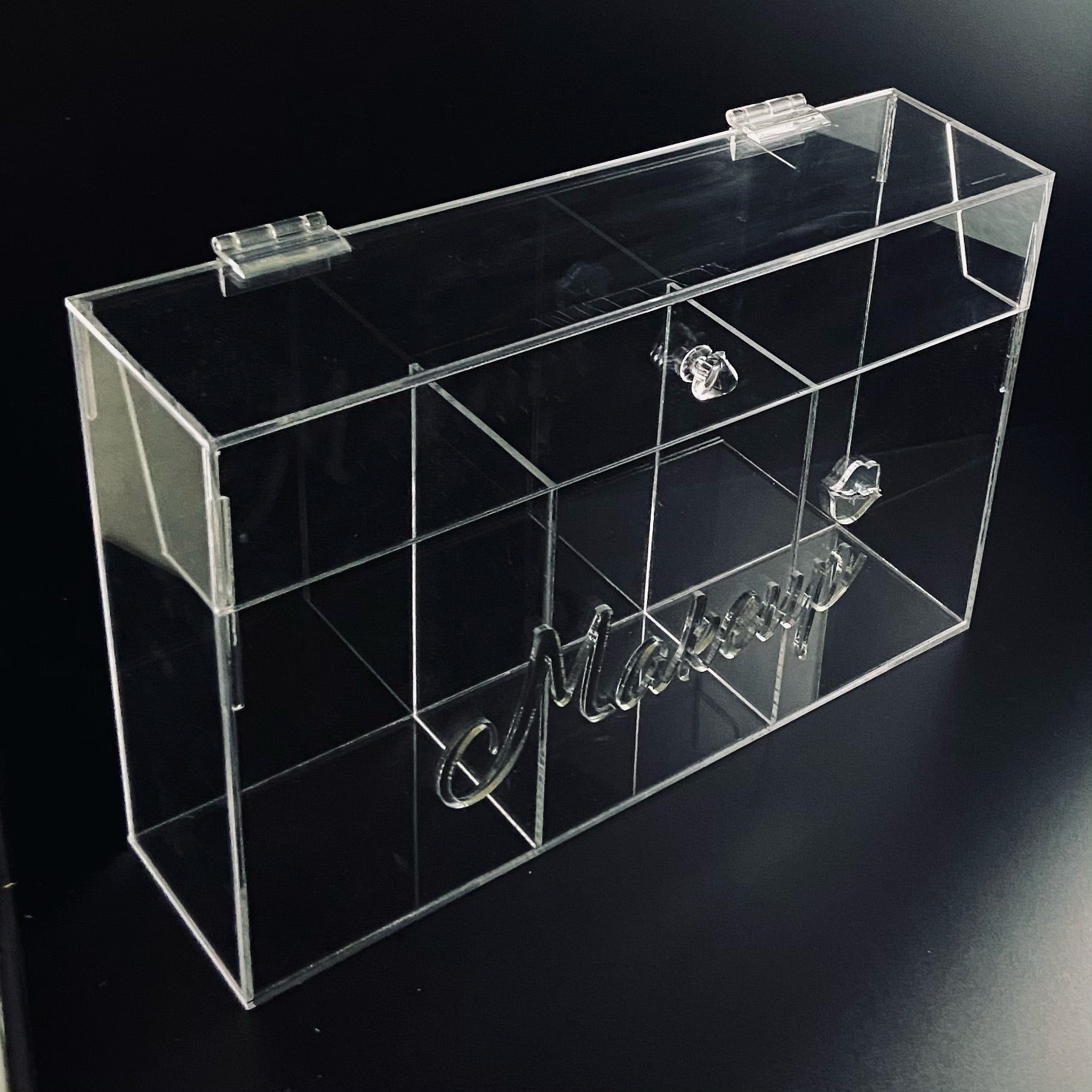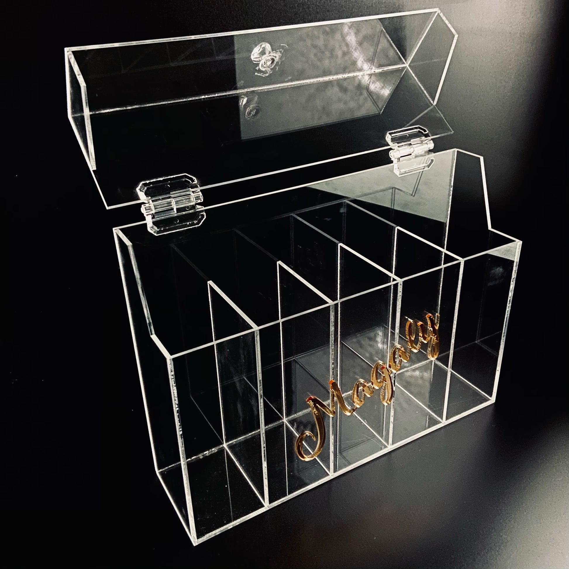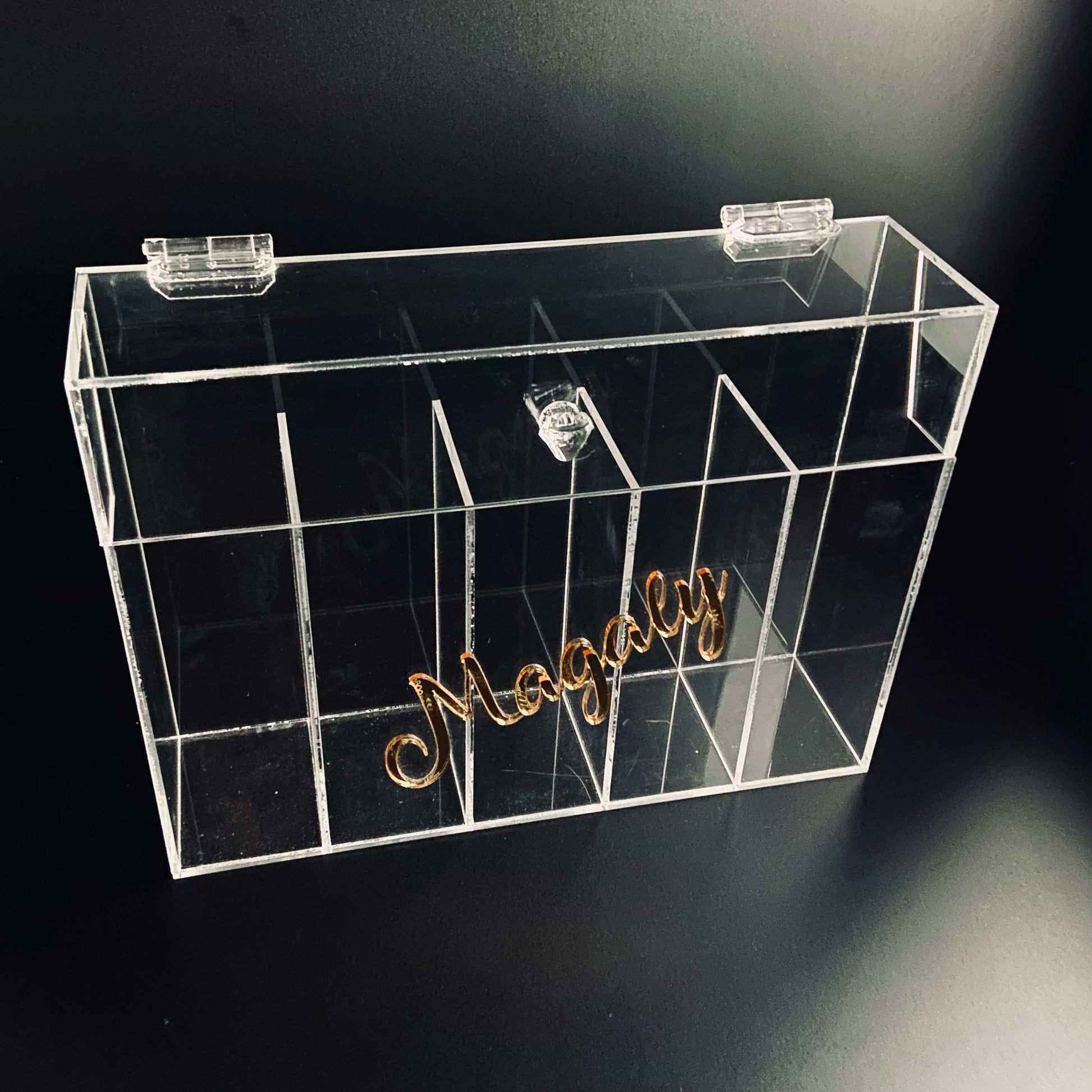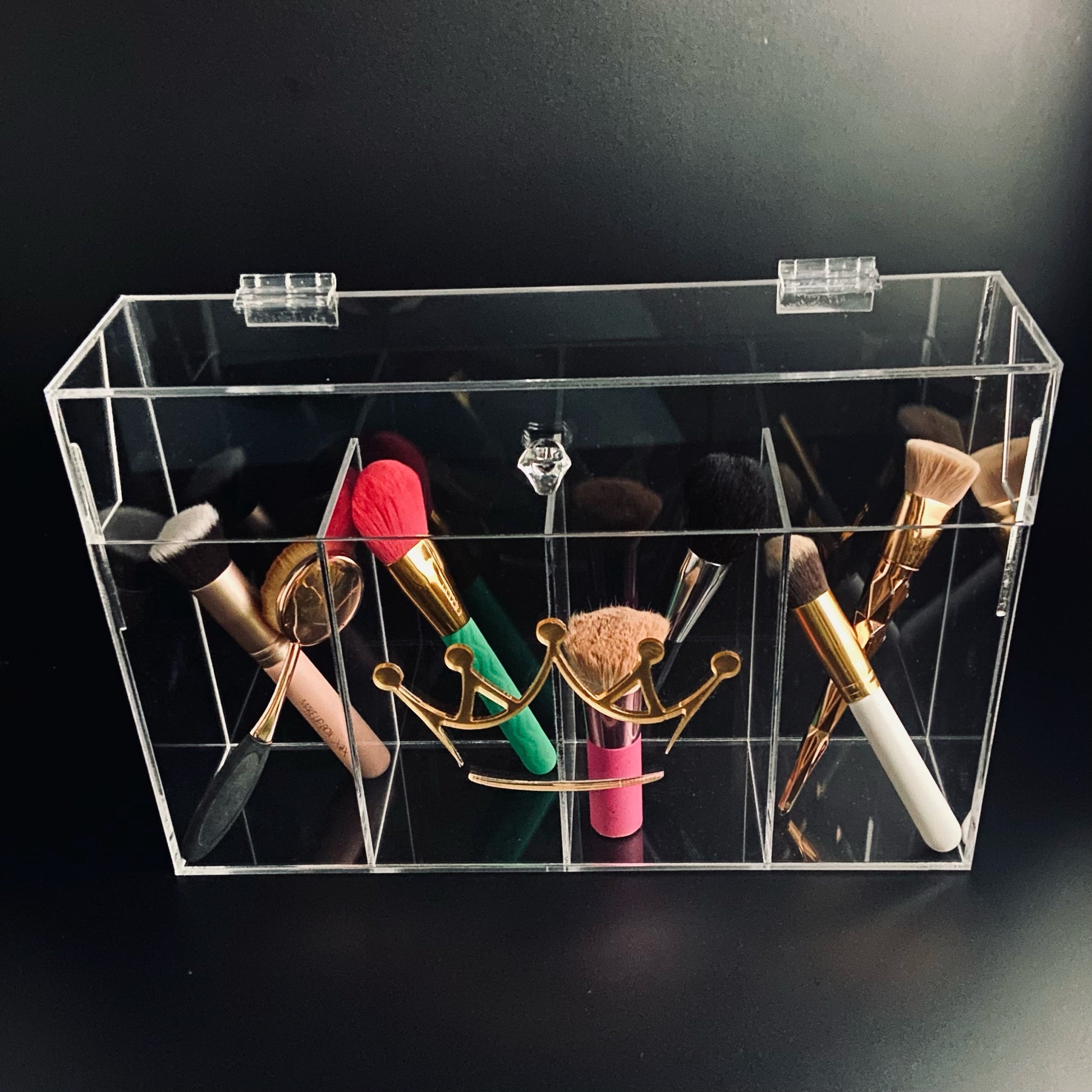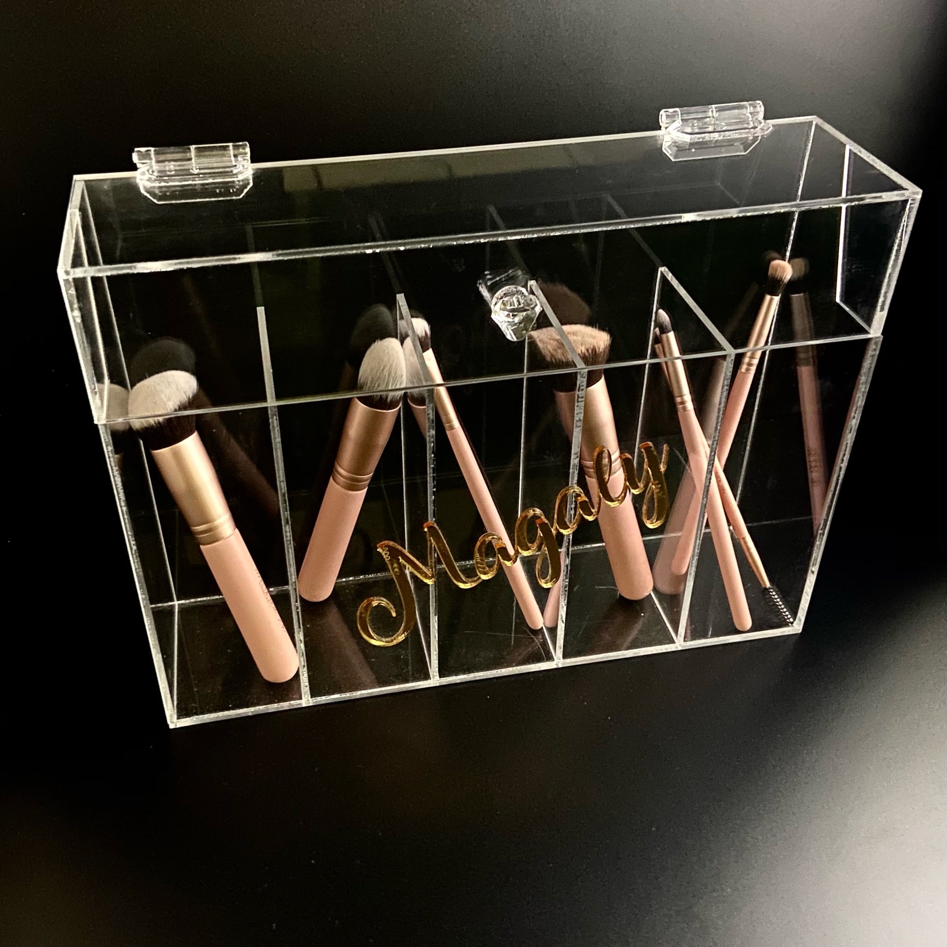 Porta brochas de acrílico con 5 compartimentos, puedes personalizar el número de compartimentos y poner tu nombre con acrílico espejo o alguna imagen de tu preferencia (debes especificarlo en la pantalla "Tu carrito" o enviarnos un Whatsapp)