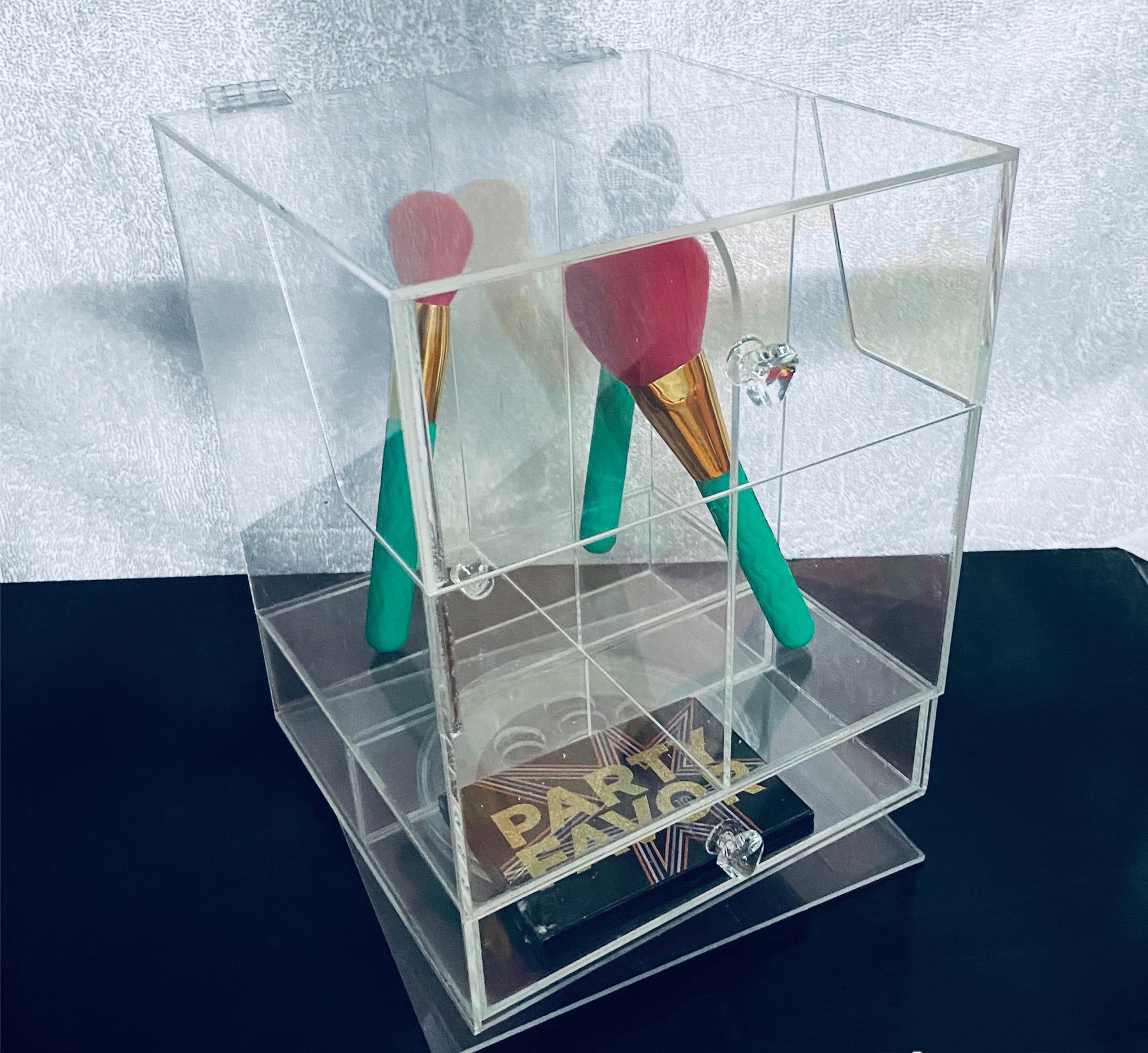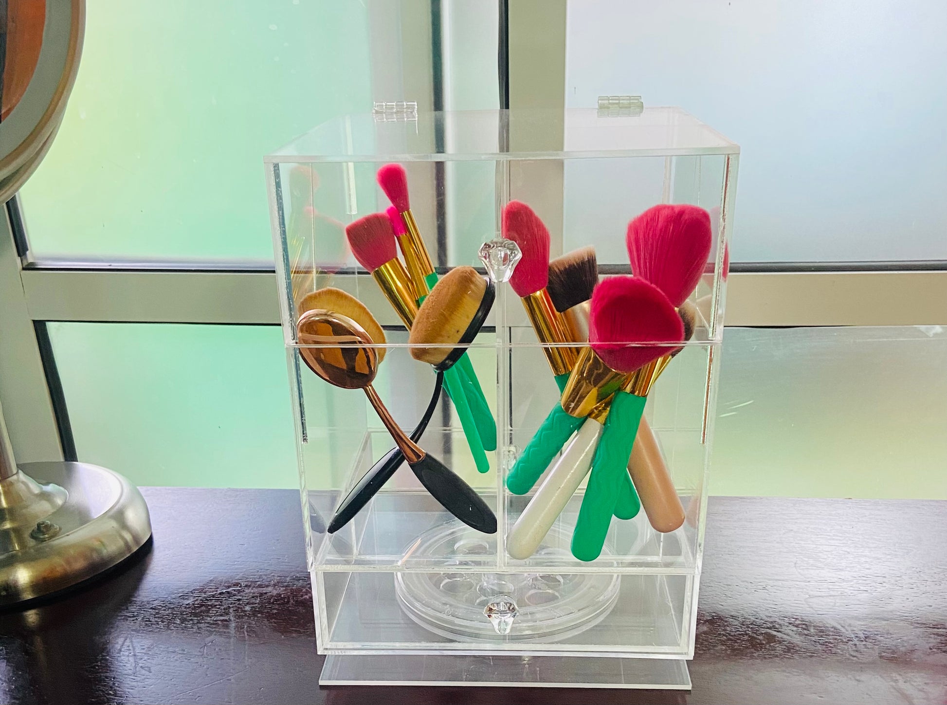 Porta Brochas giratorio con cajonera para que almacenes, organices y luzcas tu maquillaje.