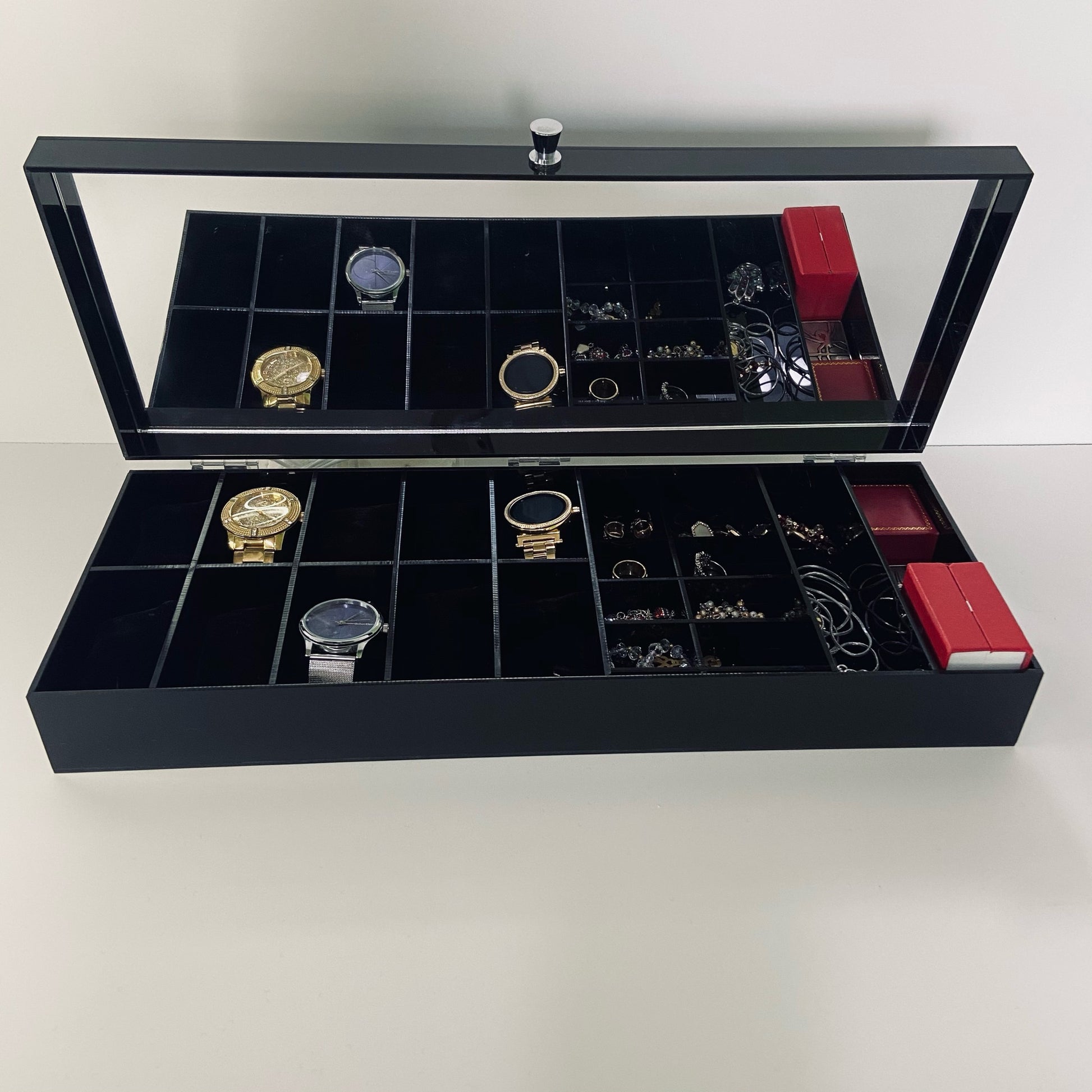 Joyero con compartimentos para relojes y pulseras, con divisiones para joyas y accesorios. (Jaladera, colores y diseño sujetos a existencias)