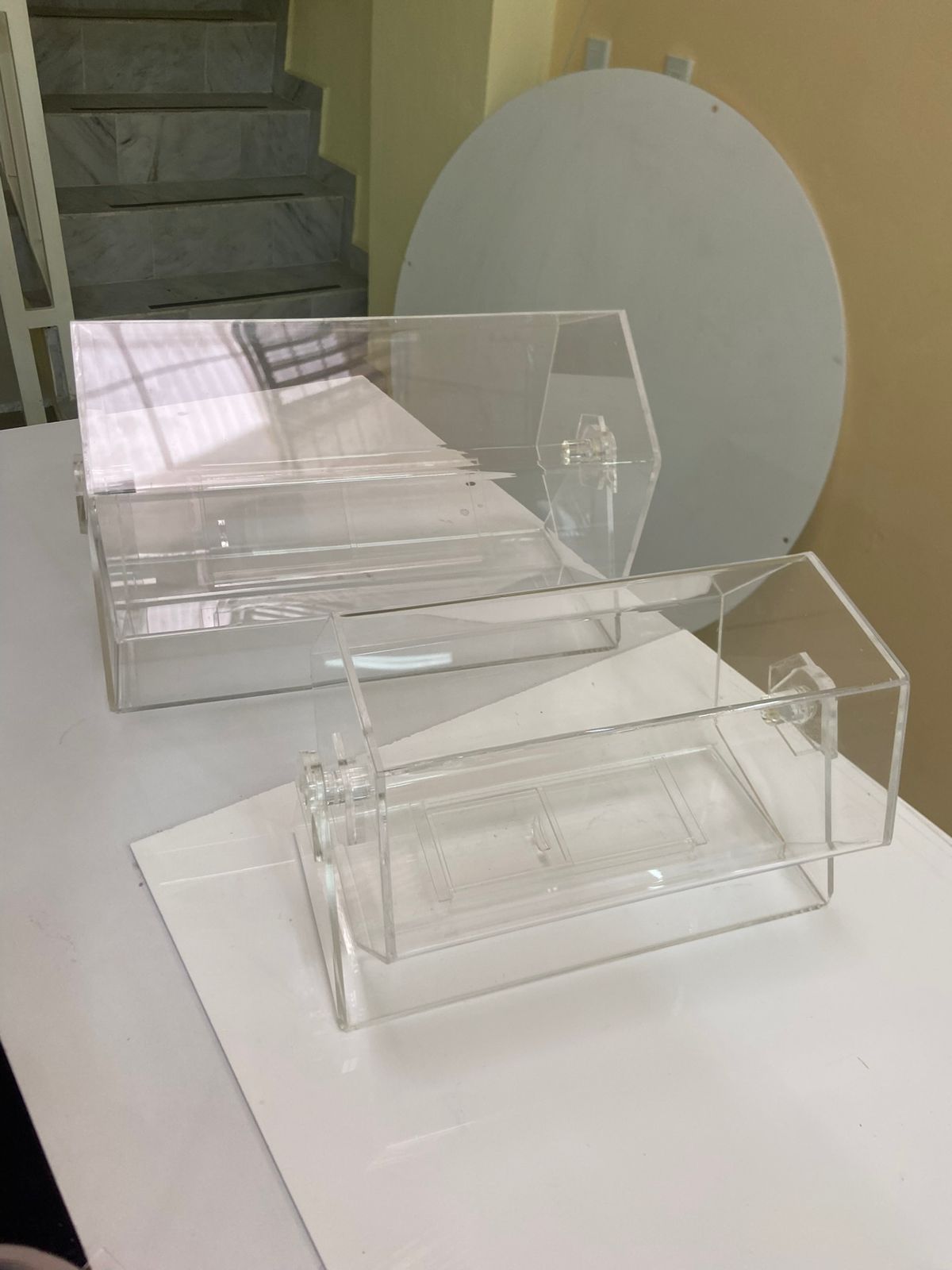 Tómbola de acrílico, con puerta y con mecanismo funcional de diferentes medidas. Elegante y resistente, con espesor del tambor en acrílico de 3mm y la base en 6mm.
